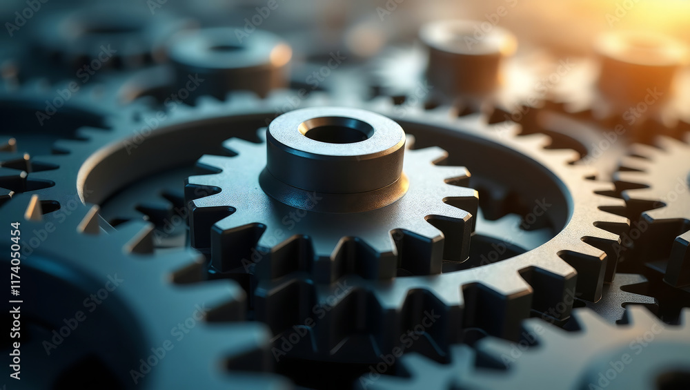 Makro - Makro-zdjęcie blokujących metalowych kół zębatych przedstawiające inżynierię, pracę zespołową i... #1174050454