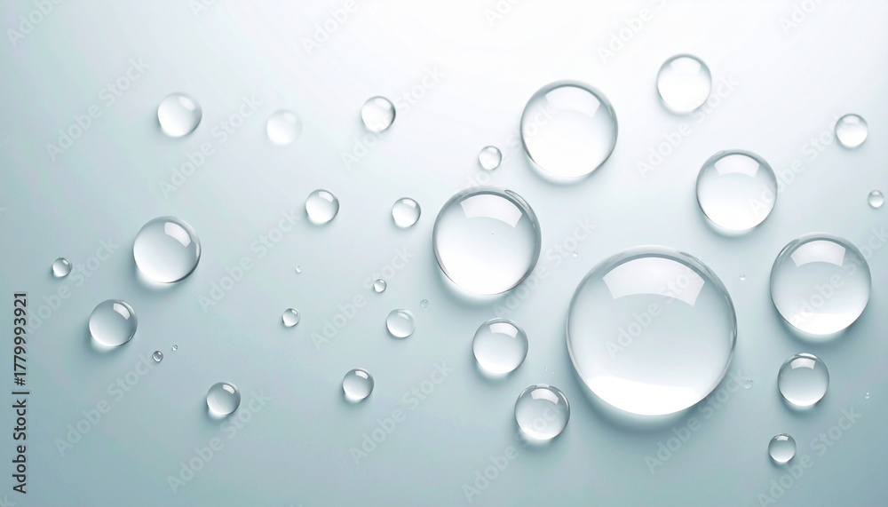 • 水滴 滴 水 丸い 球体 表面張力 透明 清潔感 清涼感 爽やか 光 反射 接写 マクロ 白背景 青 ブルー シンプル 潤い 瑞々しい