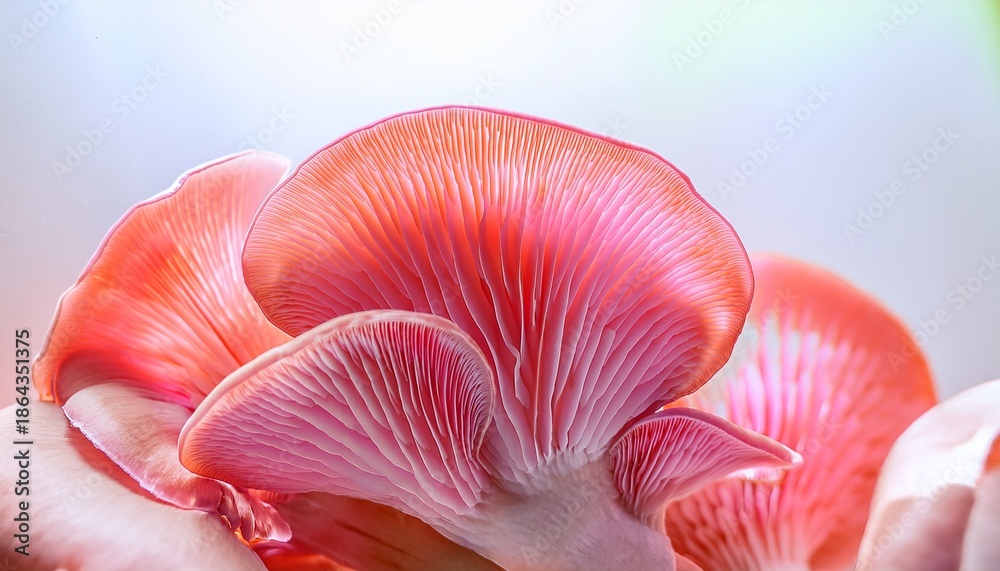 Makro - macro photo of coral pink oyster mushrooms with soft light on white background #1864351375