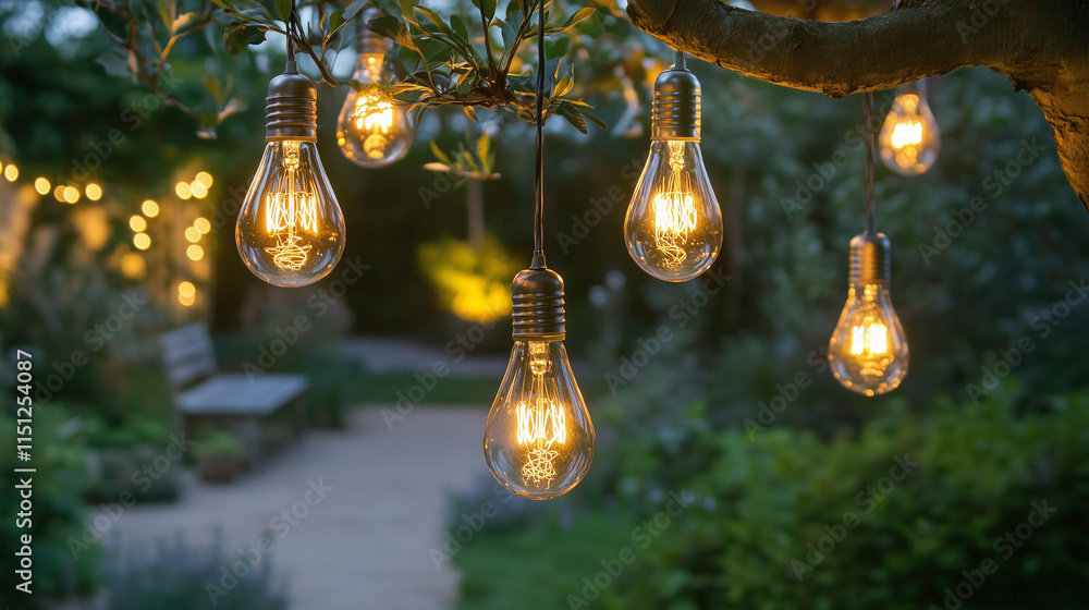 Tworzywo - Wiszące żarówki, delikatnie oświetlające gałąź drzewa, w wieczorowej, naturalnej scenerii,... #1151254087