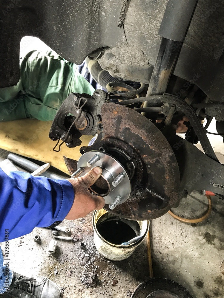 Tworzywo - Wymiana łożyska w samochodzie, widok na dłoń która trzyma nową część w zawieszenia samochodu... #173559891