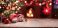 • A Christmas Tree with Balls in the Foreground and Snowflake Symbols. Fireplace. Red Lights and a Bright Garland with Stars. Light Wooden Background