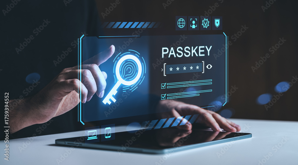 • Finger touching digital fingerprint scan interface with passkey login on futuristic screen above tablet on dark background, symbolizing cybersecurity concept.