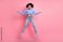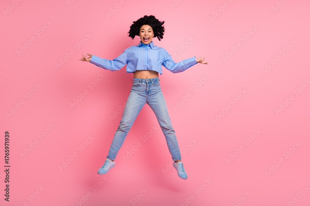 • Excited young woman jumping with joy in casual fashion on pink background symbolizing freedom and happiness