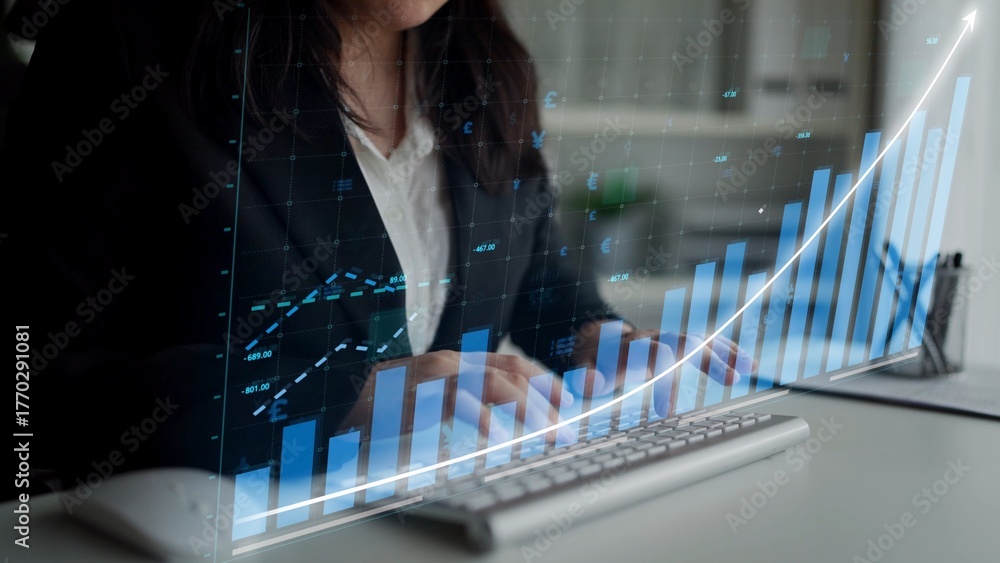 Kształty - A focused businesswoman in a black suit analyzes data insights using a computer with financial... #1770291081