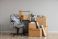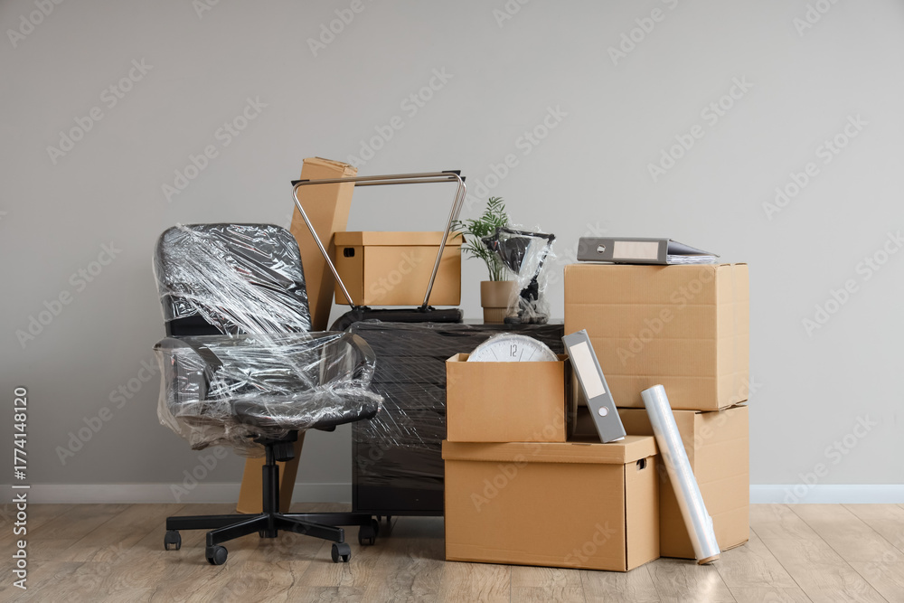 Kształty - Wrapped furniture with stretch film and moving boxes in office #1774148120