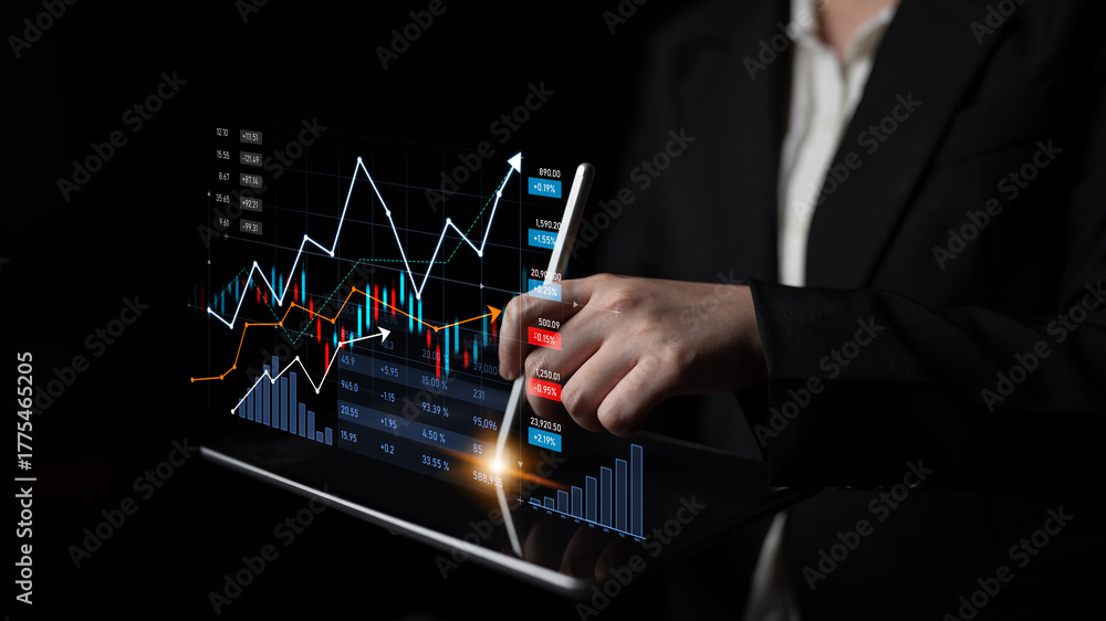 • Business professional engages with digital financial data on a tablet, showcasing graphs and trends that highlight market growth and investment potential. Scalp