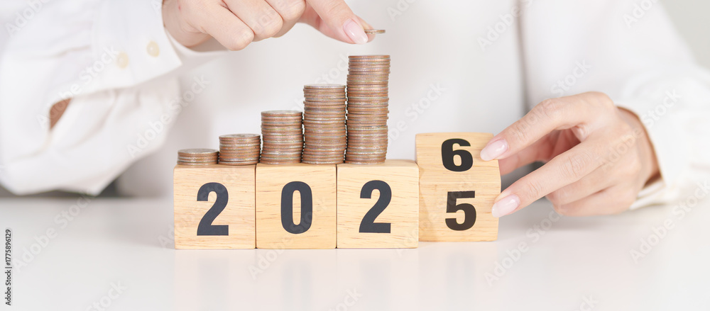 • 2025 end year to Happy New Year 2026 with Coins stack. Money, Budget, tax, investment, financial, savings and New Year Resolution concepts