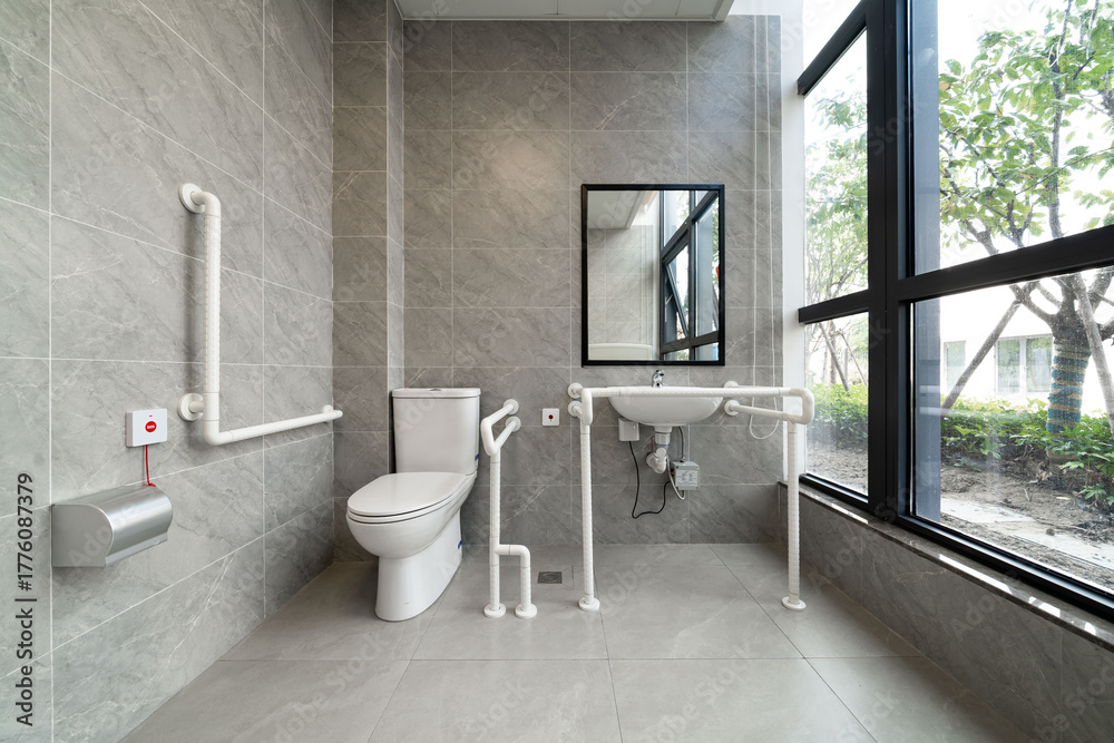 Kształty - accessible bathroom with grab bars, large windows, and gray tiles #1776087379