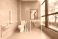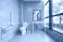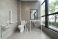 • accessible bathroom with grab bars, large windows, and gray tiles