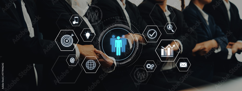 • A group of business professionals in suits participates in a corporate meeting, surrounded by digital icons symbolizing networking and teamwork concepts. Trope