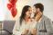 • Loving happy Valentine day couple date, affectionate people holding red heart love symbol, close in hug, kiss, showing romantic moment feeling, sharing kind emotion, romance holiday balloon decoration