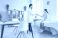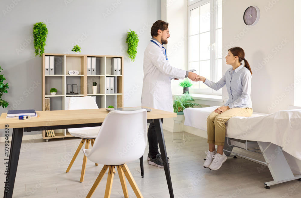 Kształty - Doctor patient consultation in medical clinic. Man physician greets woman with handshake,... #1779246678