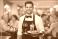 • Young man waiter smiling and holding tray with drinks and food in restaurant serving clients. Professional service at catering establishment