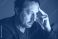 • Concerned man looking at computer screen and thinking in dark room illuminated by warm low key light.