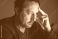 Retro - Concerned man looking at computer screen and thinking in dark room illuminated by warm low key... #1865780346
