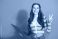 • Young female student with glasses holds a laptop and smiles while show peace sign purple background in a casual stylish fashion shoot for lifestyle and advertising use