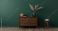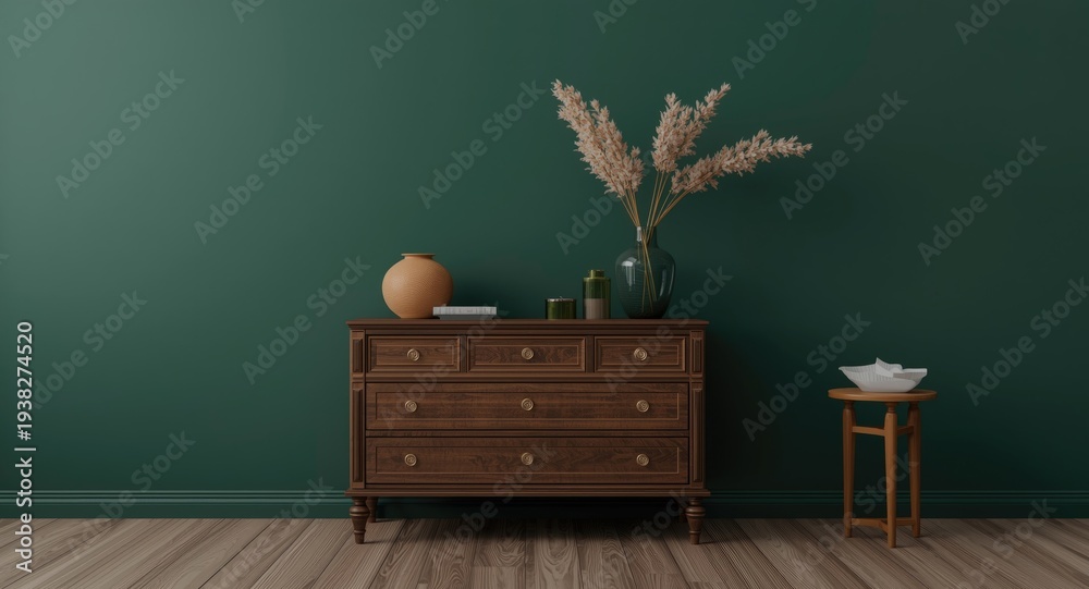 Retro - 3D render of elegant living room interior with commode and decor against dark green wall mock up... #1938274520