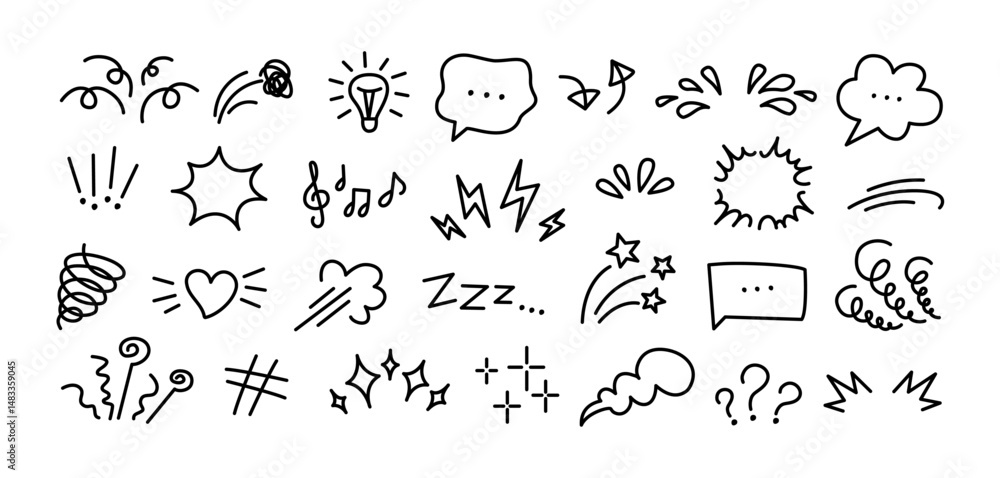 • Manga expression. Emotion and motion comic hand drawn elements. Speech bubbles, stars and swirls, lightning and music sound minimal icons for comics and media. Vector set