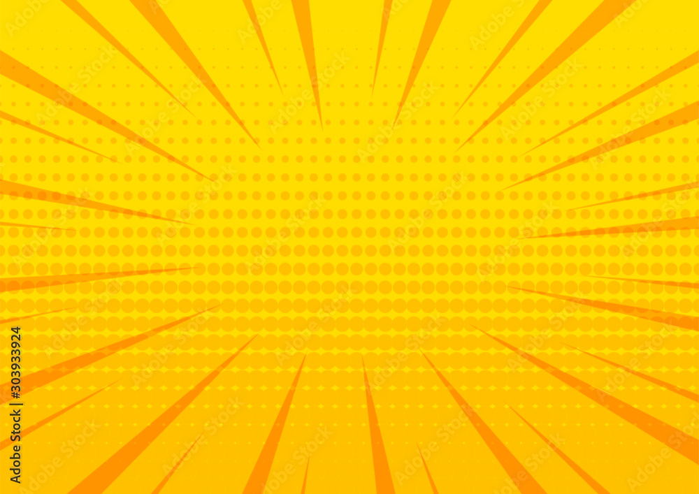 Komiks - Yellow comic pop art abstract halftone background with sunbeams, space for your text. Vector... #303933924