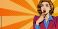 • Business woman with red hair and open mouth on yellow background in comic pop art style. Comic girl with surprised face. Wow, pop art face. Vector Banner template with copy space for text