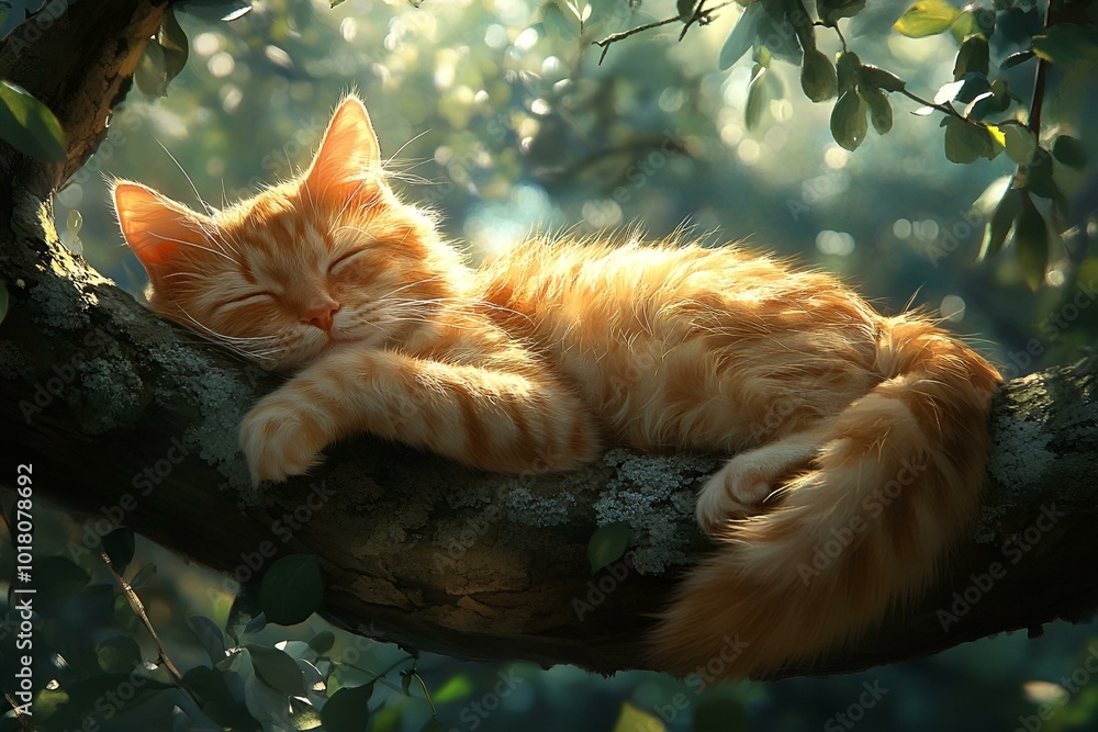 Koty - Sleeping Cat Resting on a Tree Branch #1018078692