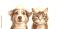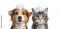 • Dog and cat with bubbly soap on their heads staring straight at the camera. Pets getting a bath together, isolated on white backdrop.