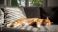 Koty - Relaxed orange tabby cat lying stretched out on a dark sofa near window with striped pillow. #1561487992