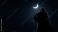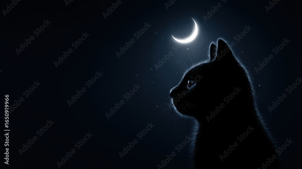 • Mysterious black cat silhouette against dark night sky with crescent moon. This minimalist image evokes spooky halloween feeling