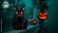 • Cinematic Halloween portrait: black cat with glowing amber eyes under moonlight and spider webs, jack-o’-lantern bokeh behind. Dark teal scene ideal for spooky seasonal posters and ads.