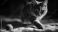• A young tabby cat plays with a fuzzy toy mouse indoors illuminated by soft ambient light