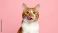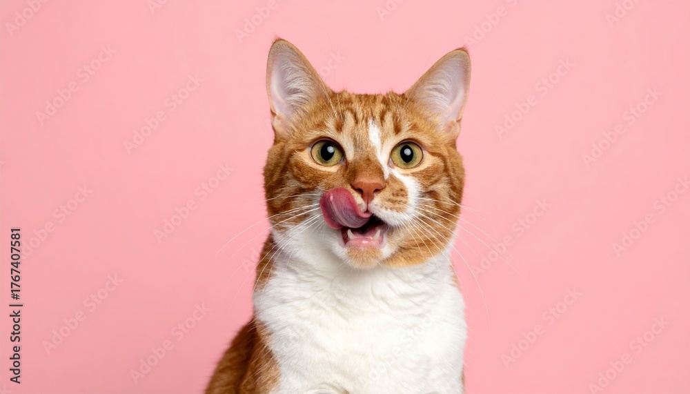 • Playful Orange Tabby Cat Licking Lip Pose Against Soft Pink Studio Background