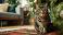 • A tabby cat sits attentively under a decorated Christmas tree in a cozy living room setting.
