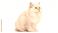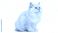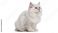 • White fluffy cat sits quietly with blue eyes, looking upwards while resting isolated on transparent background cut out