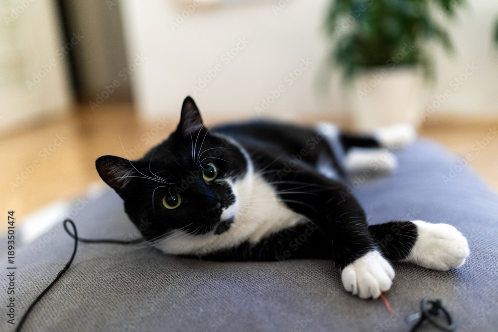 • Cute black and white tuxedo cat lying on a grey cushion at home. Playful pet relaxing on a pillow in a bright, modern living room with a green plant in the background.