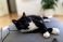 Koty - Cute black and white tuxedo cat lying on a grey cushion at home. Playful pet relaxing on a pillow... #1893501474