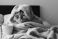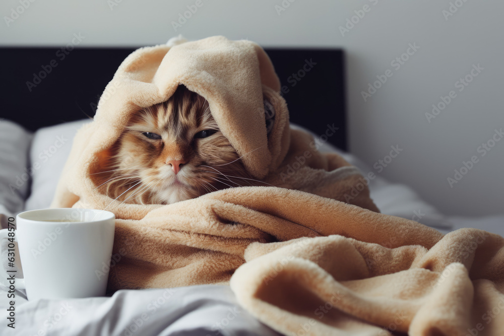 Young asian woman wears warm sweater resting with tabby cat on sofa at home one autumn day. Indoor shot of amazing lady holding ginger pet. Morning sleep time at home. Soft focus.