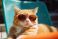 • red cat in sunglasses relaxes and chills on a sun lounger at a resort under the sun on a sunny warm