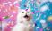 Funny portrait of a happy smiling cat on a festive background with confetti.
