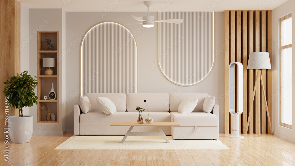 • Cozy and stylish living room with a neutral color palette, featuring a beige sofa with white accent pillows- 3D rendering