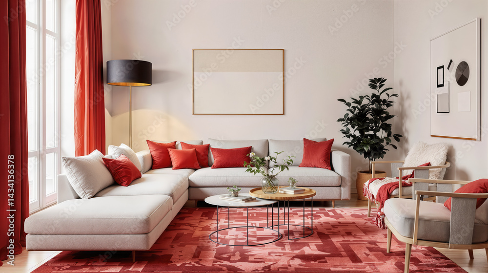 • A modern living room with a vibrant color palette, featuring a grey sofa adorned with red cushions and a red carpet, a wooden coffee table with potted plants and books