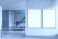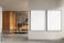 • Modern office interior with blank white posters on partition wall and wooden desks in background illuminated by ceiling lights. 3D Rendering