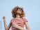 • Young person with curly hair smiles under a clear blue sky, wearing a red and white striped shirt and sunglasses, radiating carefree summer energy and playful confidence.