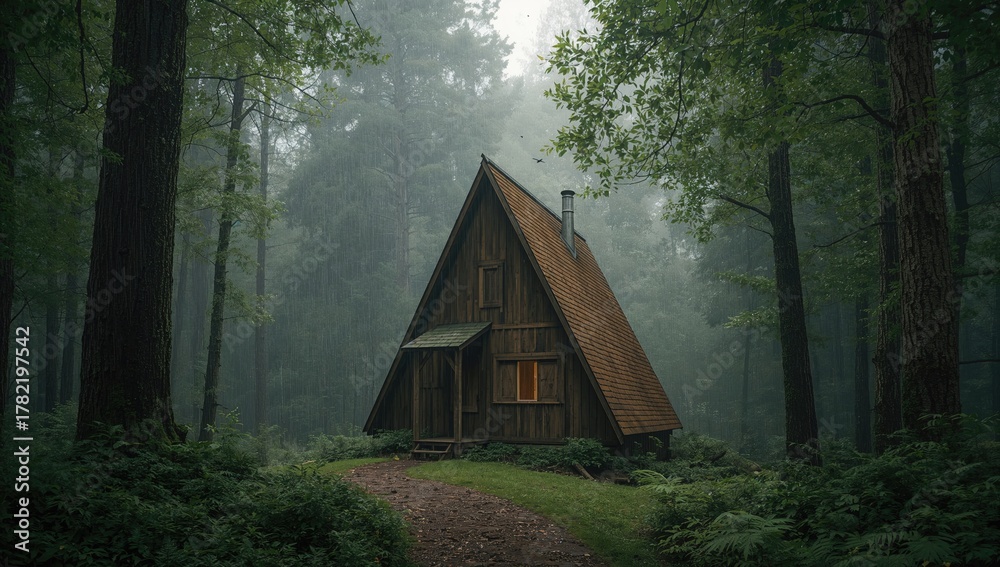 Zwierzęta - Wooden triangular cabin nestled in the woods during rainy weather #1782197542