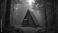 • Wooden triangular cabin nestled in the woods during rainy weather