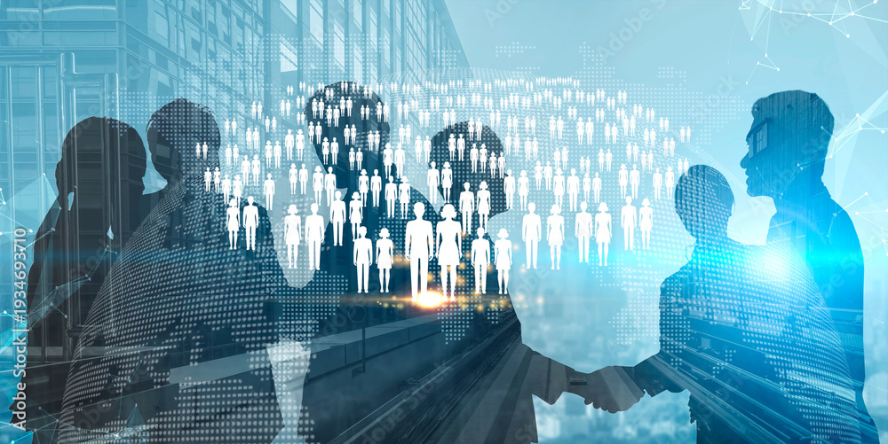 Zwierzęta - Business professionals shaking hands in a modern corporate environment with digital connections... #1934693710