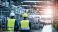 • Factory supervisors wearing safety helmets and safety vests observing production line operation for quality control