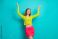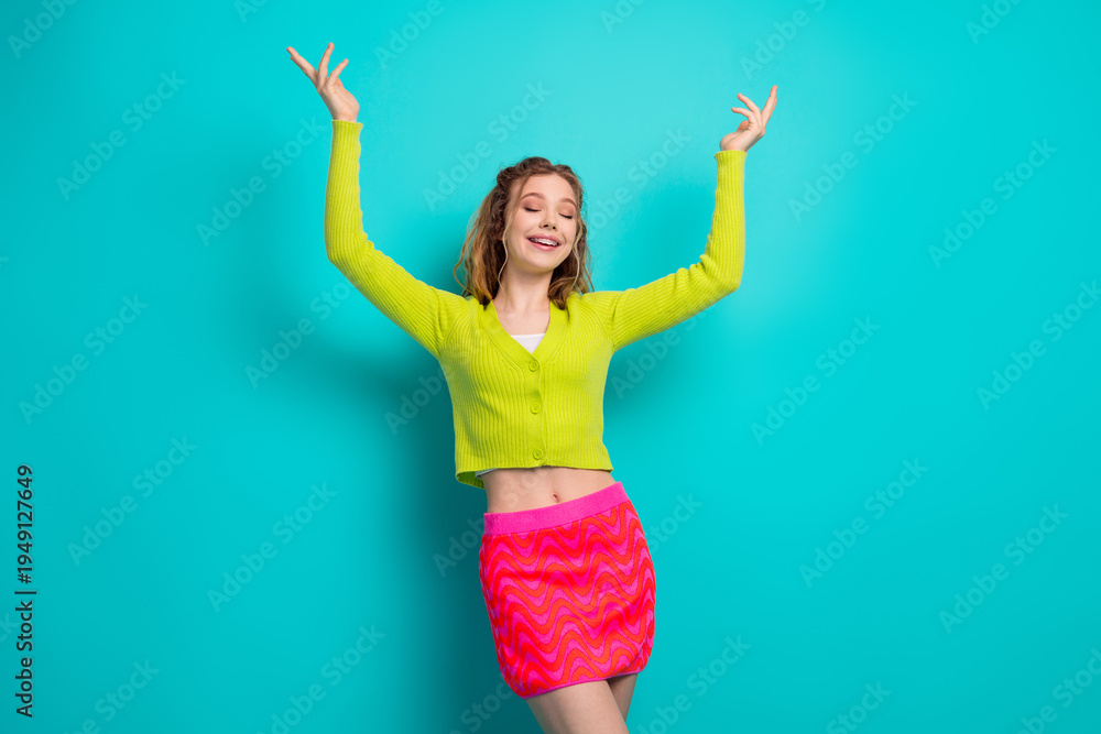 • Cheerful young woman in vibrant outfit posing excitedly against a turquoise background, expressing joy and energy