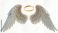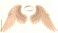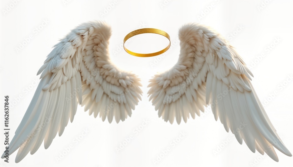 • Pair of large white angel wings with golden halo. Isolated on plain white background. Graceful design. Spiritual symbol. Elegant illustration. Ideal for religious themes. Fantasy concept. Represent