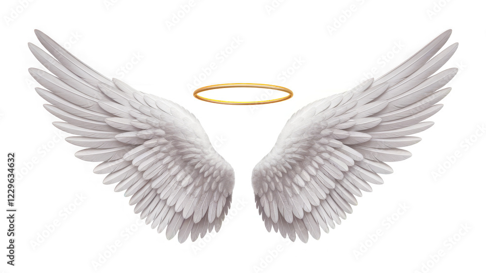 • white angel wings with a gold halo isolated on a transparent background.
